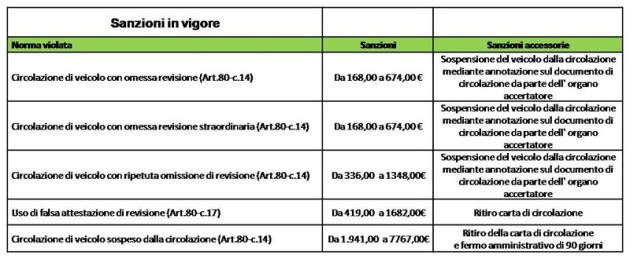 In caso di verifica da parte degli organi preposti (es. Carabinieri, Polizia, ecc.), chi circola con un veicolo non revisionato è soggetto alla sanzione amministrativa di € 168,00 , somma che può aumentare secondo le aggravanti (es. recidiva, uso di falsa attestazione di revisione, ecc.).